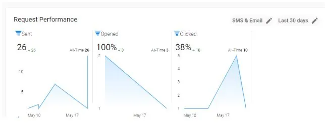 This is the customer voice performance dashboard – the epicenter for understanding your interactions with customers. With this tool, you go beyond simply reaching out to clients, but get a click-by-click idea of how people are responding to your email and text message outreach. You can monitor when you send out emails, how many people have opened them, and what percentage of people are going further and clicking on your outreach. You can also view new reviews and what they say, as well as program responses for positive reviews and negative reviews based on sentiment feedback technology.