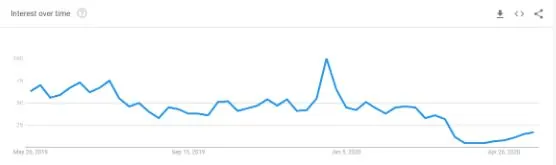 This is the trend for the search term “movie theater” in Florida over the past 12 months. Most movie theaters have closed as a result of COVID-19, and as you can obviously see on the graph, the amount they were searched on Google took a big hit around March, when the virus initially began shutting things down.